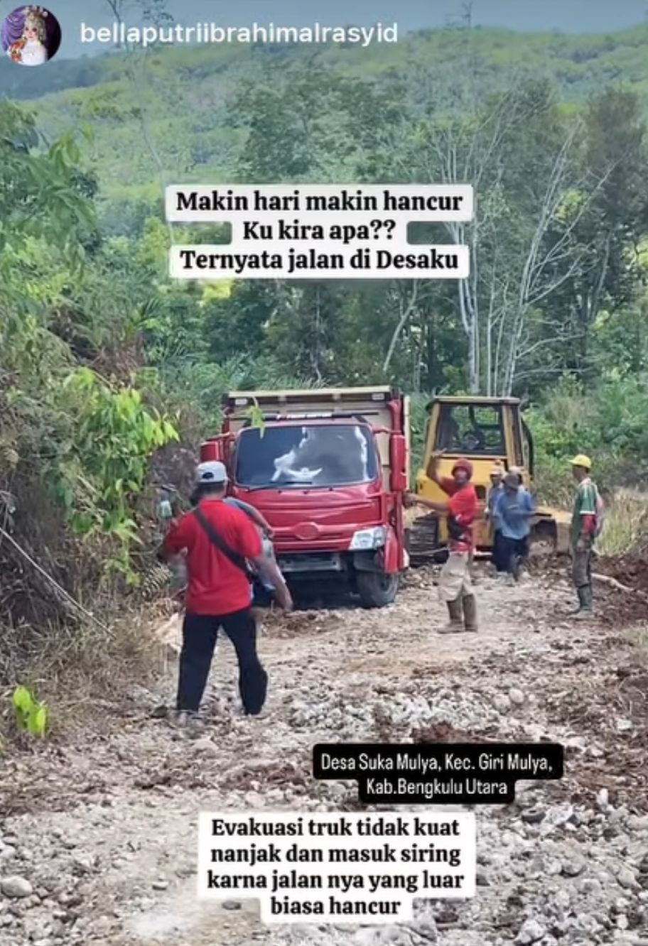 “Makin hari makin hancur, kukira apa? Ternyata jalan Desaku,” tulisnya lewat caption video dengan menandai akun pribadi Bupati Bengkulu Utara, Arie Septia Adinata.