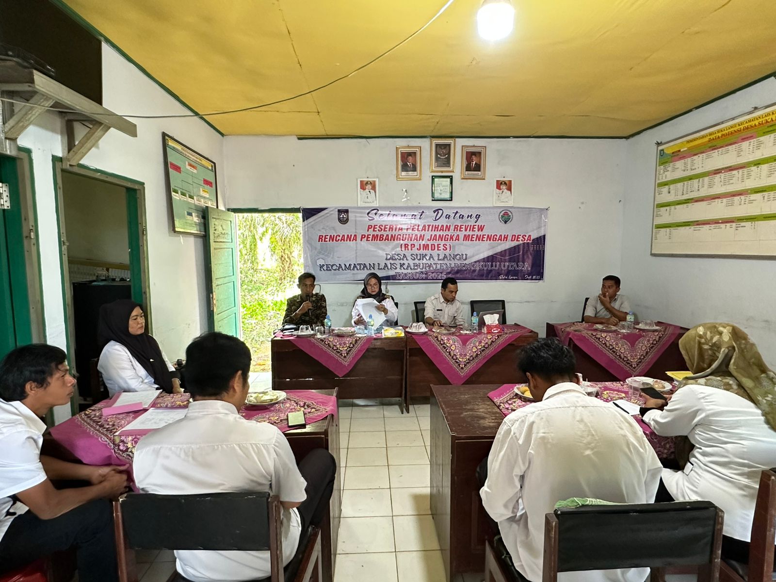 Acara ini dihadiri oleh Bimbo Muharam, S.Sos selaku narasumber dari DPMD Bengkulu Utara, Camat Lais, Kasi PMD, Kepala Desa Suka Langu, BPD, serta tim penyusun RPJMDes.